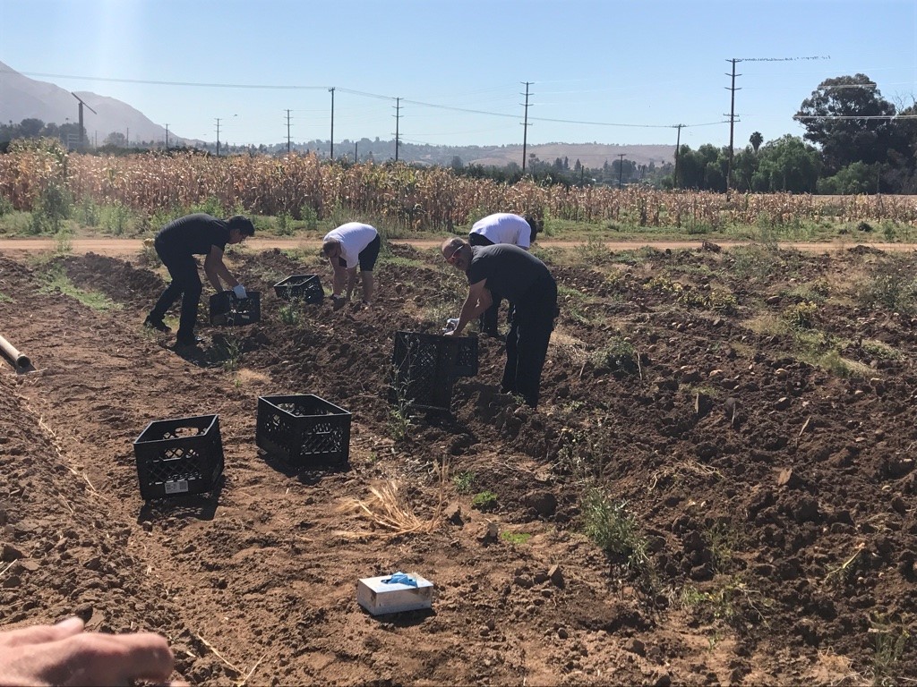 Four workers in field harvesting row crop