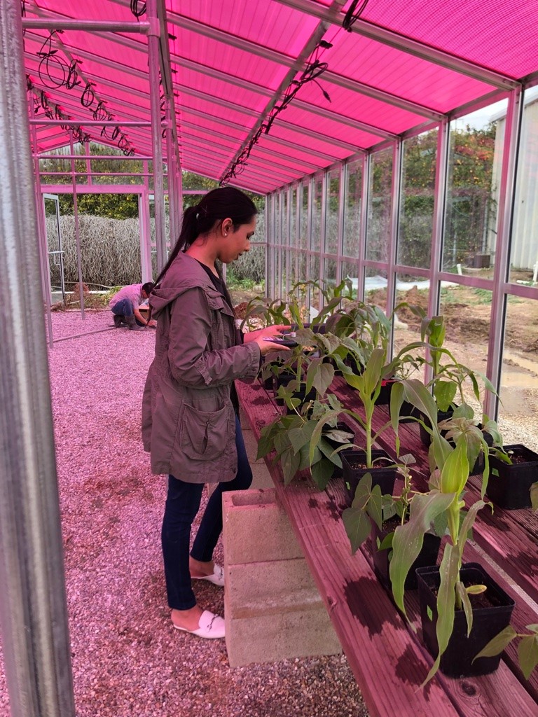 Girl in Solar Greenhouse looking at plants