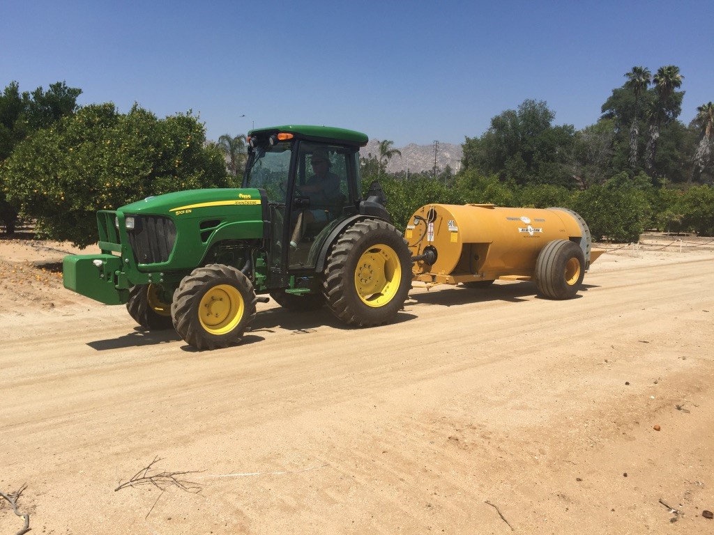 Tractor on road with sprayer attached